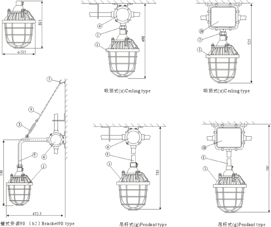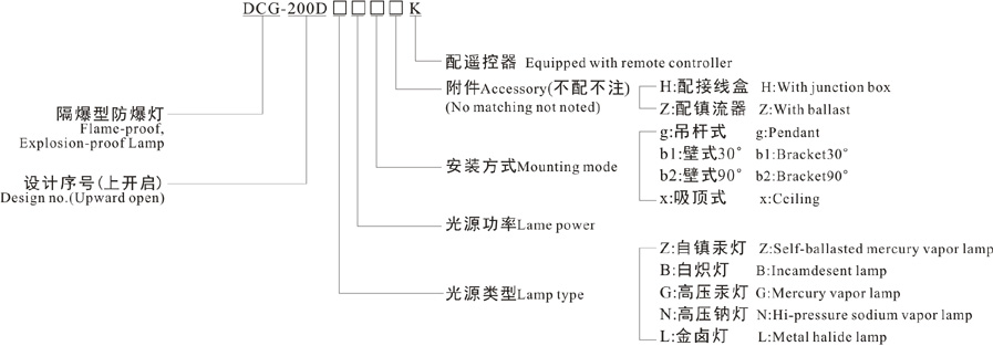 1、Select item by item according to description of product model, if a pendant type product with halide lamp of 70W and junction box, its model shall be DCG200-DL100gH.