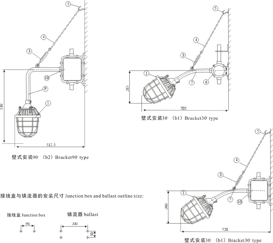 1、按產(chǎn)品型號說明逐條選擇,例:需配用光源為金鹵燈100W、吊桿式安裝、配接線盒、則產(chǎn)品型號為DCG200-DL100gH;