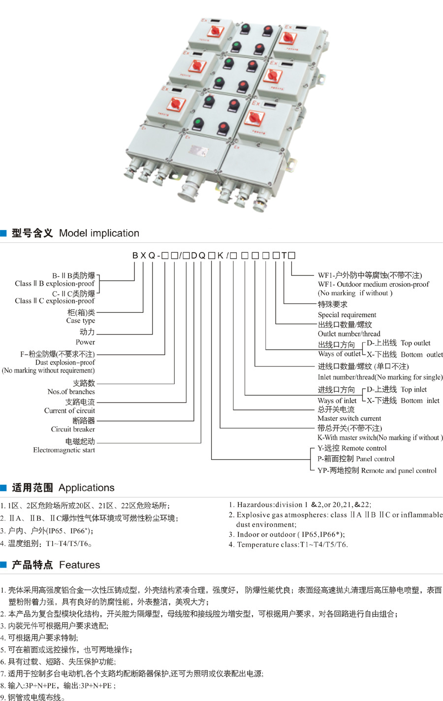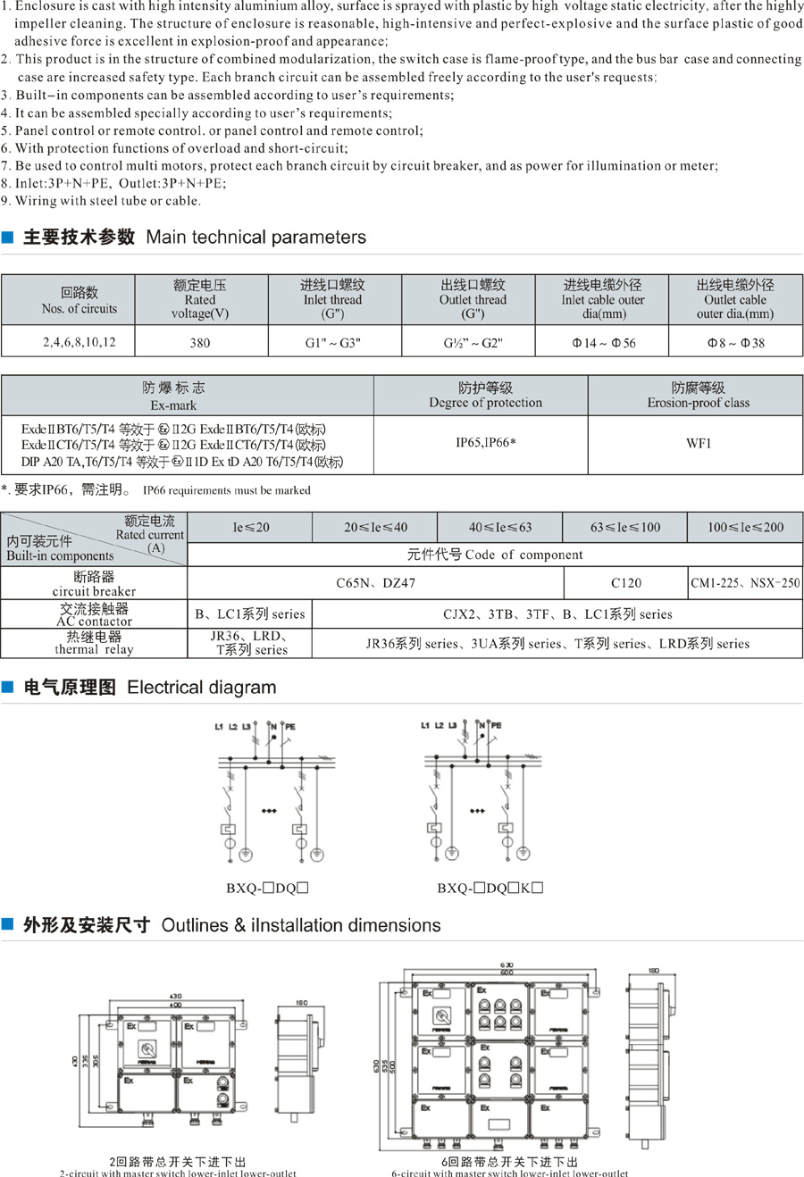 1、壓鑄鋁合金或鋼板焊接外殼,表面噴塑。 2、適用于控制多臺電動機(jī),還可為照明或儀表配出電源。 3、內(nèi)裝元件可根據(jù)用戶要求選配。 4、可在箱面或遠(yuǎn)控操作,也可兩地操作。 5、具有過載、短路、失壓保護(hù)。 6、鋼管或電纜布線均可。">